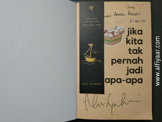 Pertama kali saya menemukan novel yang berjudul Jika Kita Tak Pernah Jadi Apa-Apa dari social medianya penulis Kak Alvi Syahrin beberapa bulan lalu viral yang membuat aku tertarik untuk membacanya dan novel ini yang pertama aku baca di awal tahun 2021. Buku dengan ukuran Panjang, lebar dan tebal yang asik buat dipegang. Warna cover-nya Favorite banget, hitam. Buku dengan sampul berlatar hitam dan huruf berwarna kuning cerah itu memberikan pemahaman bahwa kita tetap harus berjalan penuh semangat bila tidak menjadi apa-apa.